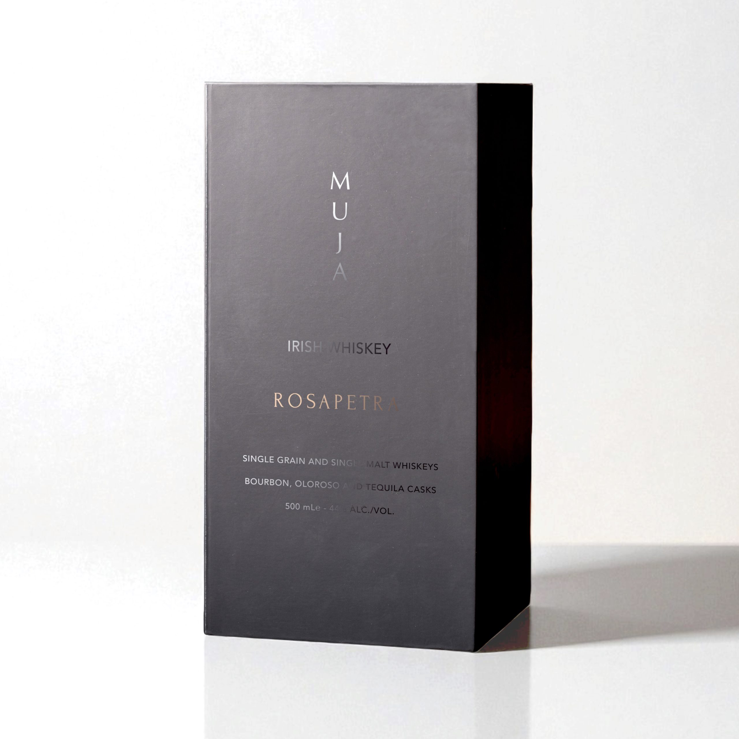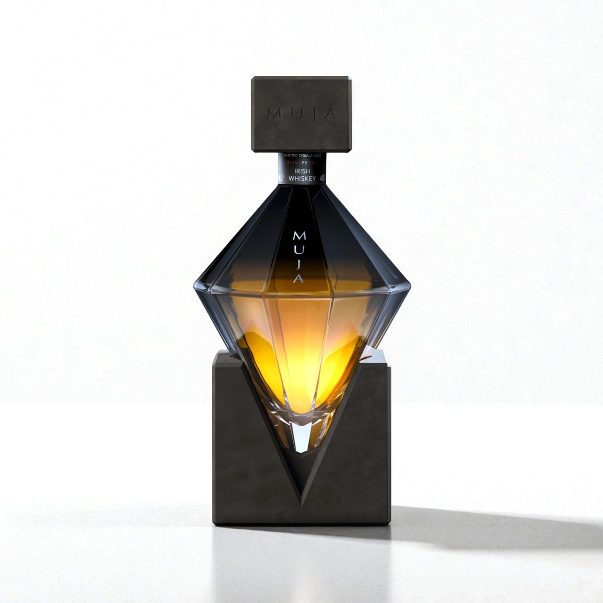 Muja Irish Whiskey Rosapetra is crafted with meticulous care, revealing a rich, complex character subtly shaped by tequila cask maturation. Housed in a smoky black diamond-shaped bottle with a black concrete base and stopper, it reflects the harmony of craftsmanship and modern design.